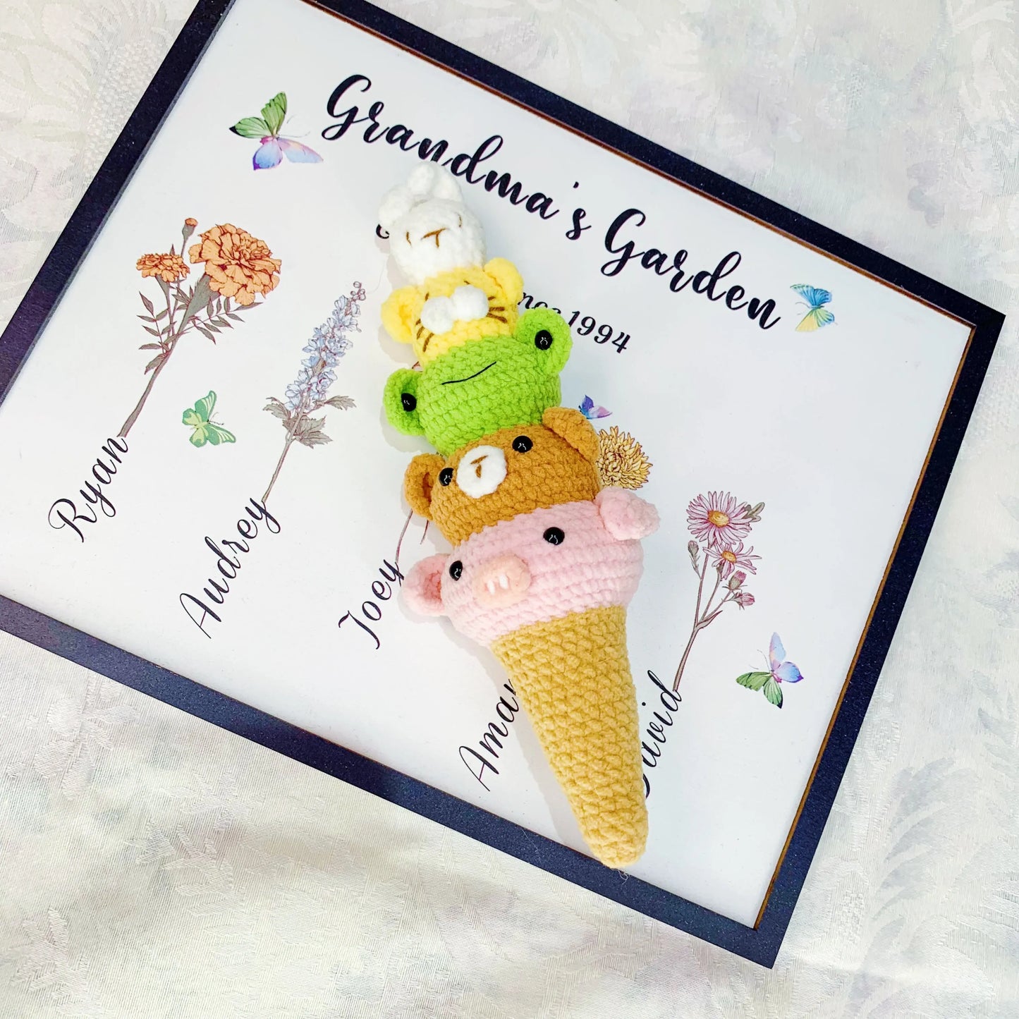 Wir präsentieren das Häkelmuster für gestapelte Tier-Eiscreme – eine skurrile und bezaubernde Kreation, die Essen und Niedlichkeit vereint! 🍦🐷🐻🐸 Dieses entzückende Design zeigt eine Tüte mit einem Stapel liebenswerter Tier-Eiskugeln: ein rosa Schwein, ein fröhlicher Bär, ein leuchtend grüner Frosch, ein verspielter Tiger und ein flauschiges Häschen. 🌟
